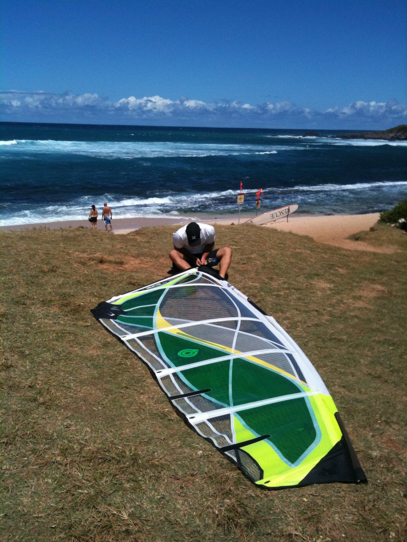 11:15AM, lighter winds, underpowered 4.7, 4 guys out, trying to get through the large sets coming in. Chicken jibing. Getting out. Dialing in the first wave ride with a quick, tentative single cutback. Repeat several times.